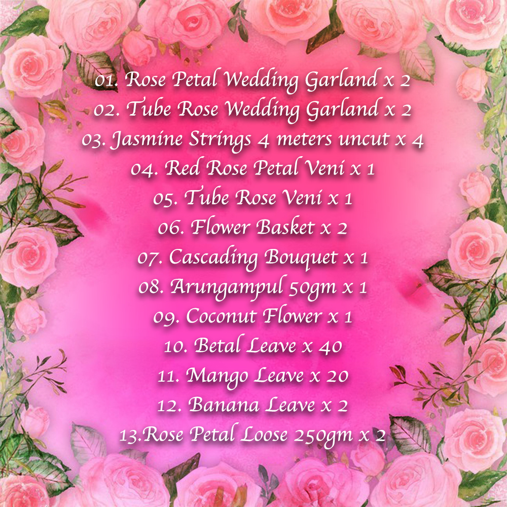 Rose Petal Andal Garland x 1 Jasmine Strings 4 meters uncut x 4 Red Rose Petal Veni x 3 Flower Basket x 2 Cascading Bouquet x 1 Arungampul 50gm x 1 Betal Leave x 20 Neam Leave Banana Leave x 2
